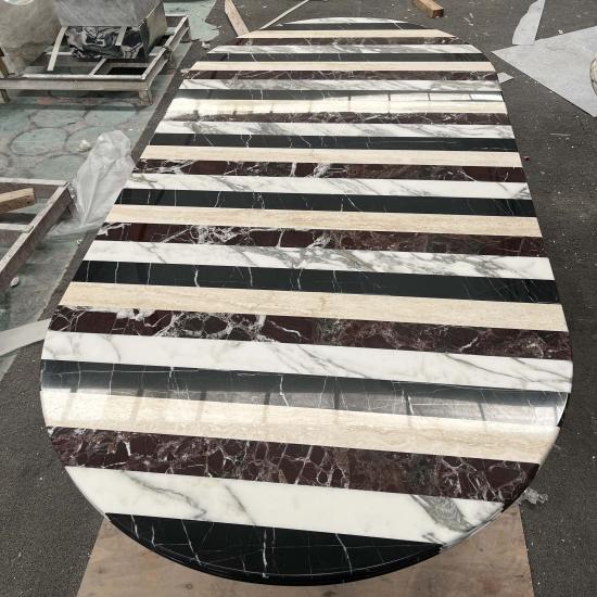 Cette table à manger au plateau en marbre présente un motif d'incrustation sur mesure composé de quatre pierres naturelles d'exception : marbre noir Nero Marquina, marbre blanc Calacatta, marbre bordeaux Rosso Levanto et travertin naturel. Chaque bande de pierre est taillée avec précision, incrustée harmonieusement et polie pour obtenir une finition miroir ultra-brillante, créant ainsi un motif rayé audacieux et rythmé qui offre un impact visuel exceptionnel et un charme artistique indéniable.